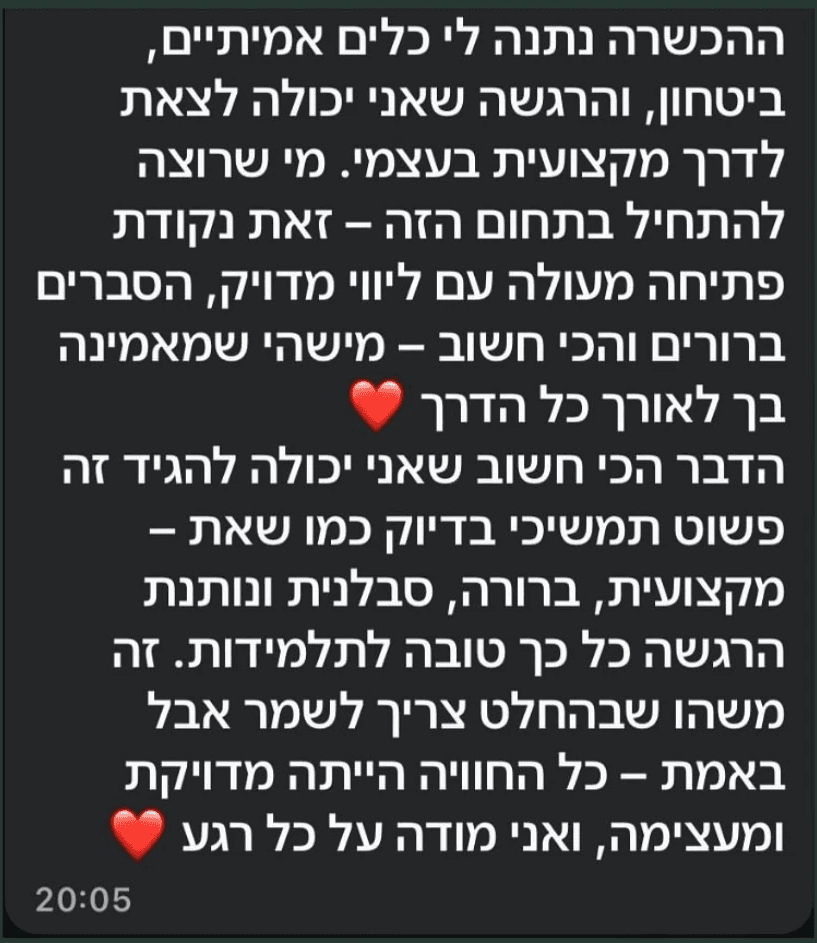 אנחנו עובדות יחד עד שיש לך מקצוע בידיים וביטחון אמיתי לקבל לקוחות.